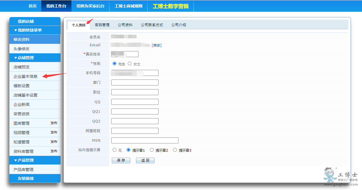 2.商家登陸店鋪后臺(tái)后,在左側(cè)找到【企業(yè)基本信息】,點(diǎn)擊【個(gè)人資料】即可修改個(gè)人聯(lián)系方式。