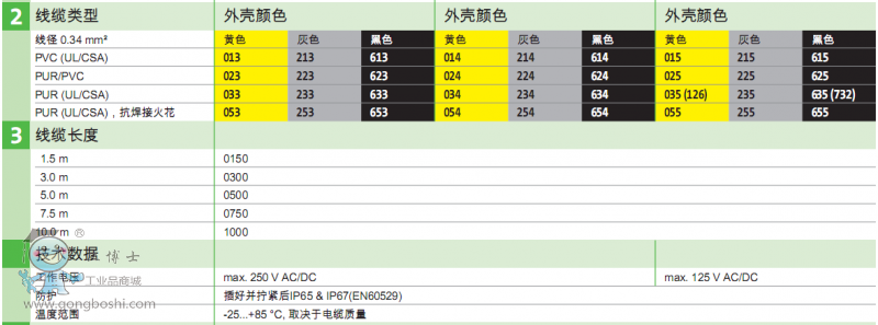 第2組數(shù)字 護(hù)套線材料/顏色 033 代表PUR(UL/CSA),黃色
