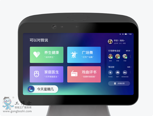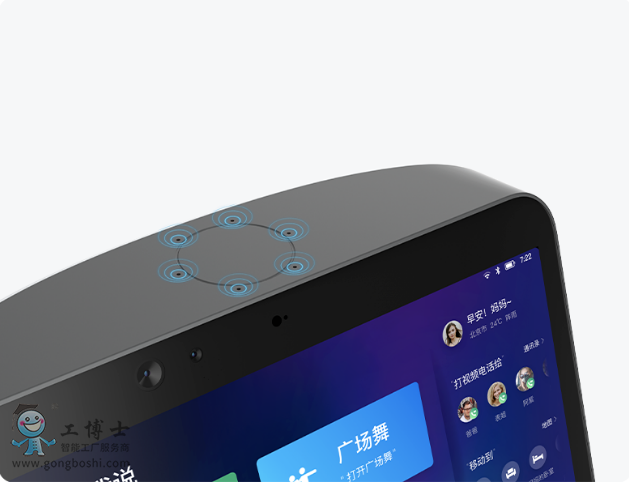 頭部頂端中間區(qū)域集成了語音交互區(qū)(6MIC)和觸摸喚醒區(qū)(中間環(huán)狀按鍵),輔以凹凸造型的功能快捷按鍵,一鍵跟隨,方便快捷。